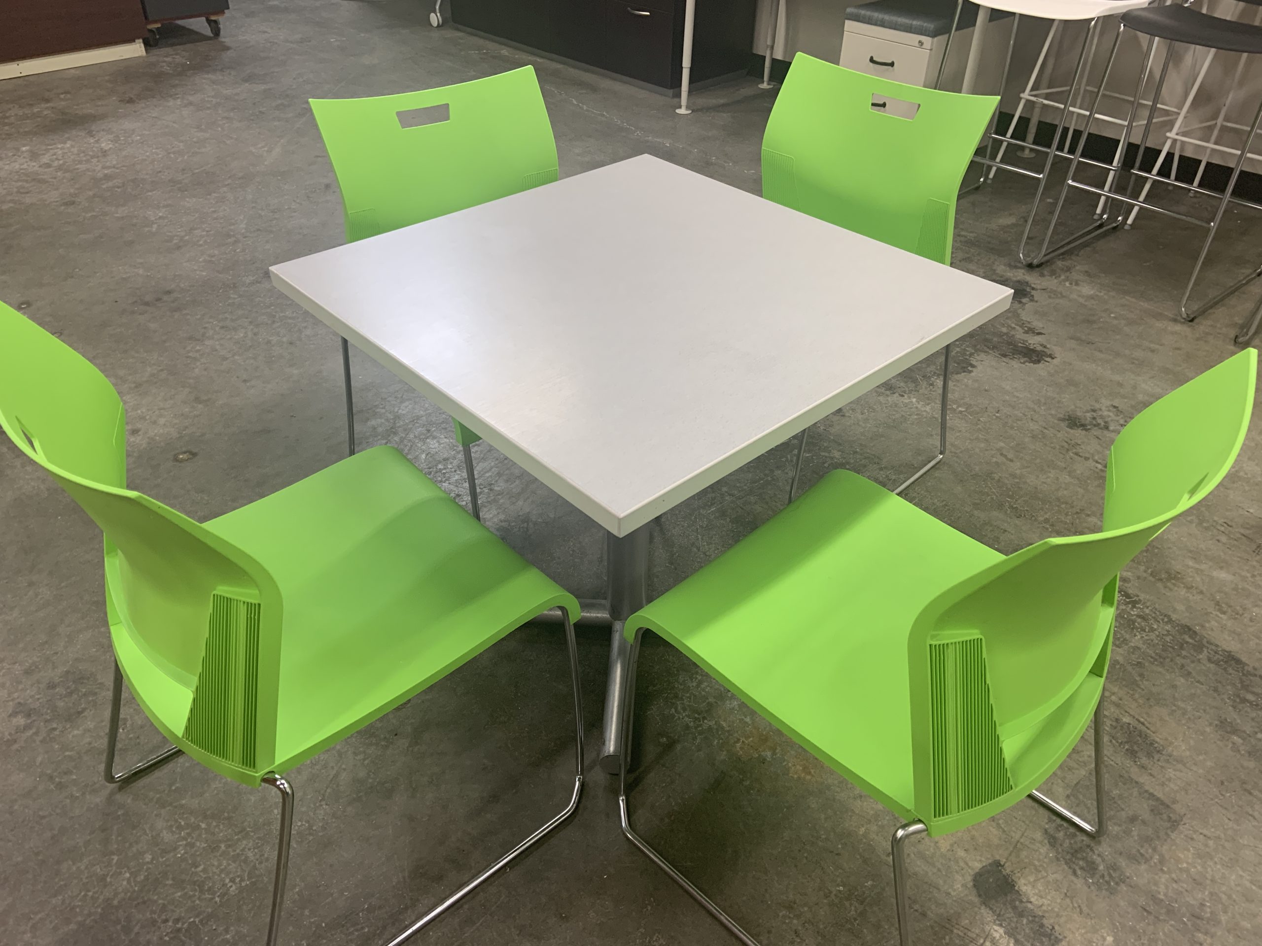 Refresh your break room with this stylish break room set from Panel Systems Unlimited! Featuring Global Duet stack chairs in vibrant green cactus color, known for their sturdy, stackable design, paired with special T tables—30″x30″ square tables and 30″W x 72″L rectangular tables. Perfect for collaborative lunches or casual meetings, this set combines durability and modern appeal. In stock now—contact us to reserve before they’re gone!